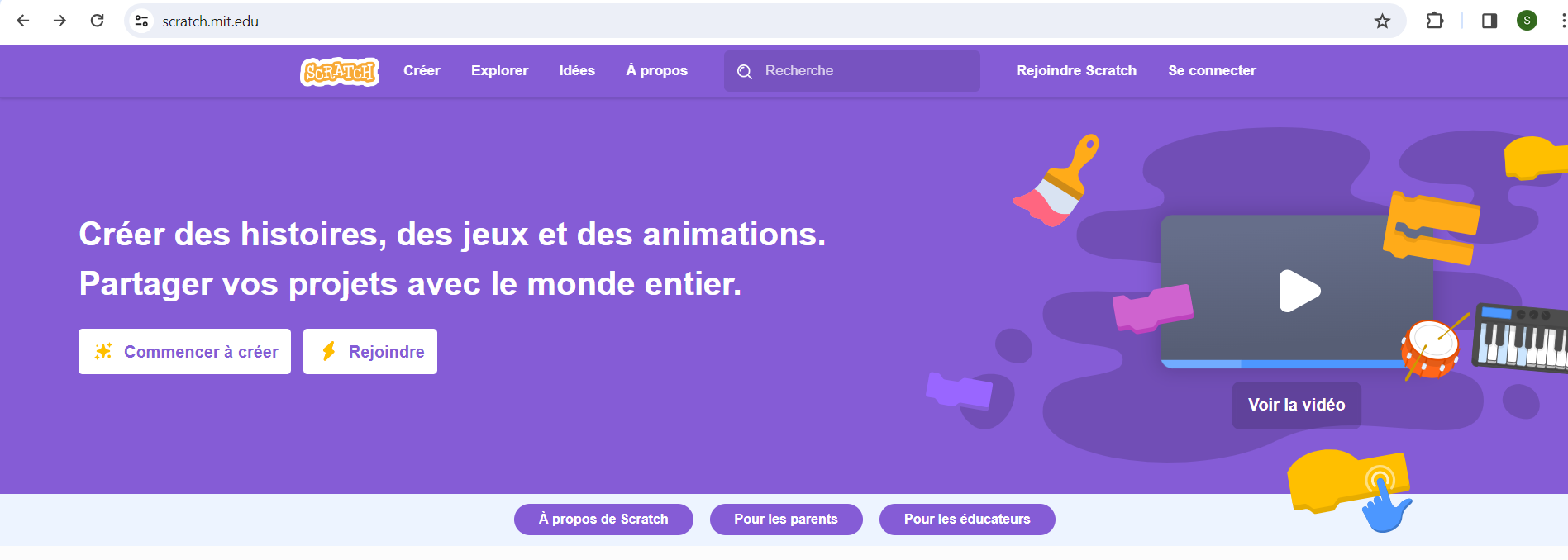 Pour accéder à Scratch en ligne il te faut accéder à la page www.scratch.mit.edu. Scratch est gratuit, tu peux l’utiliser sur le site Web sans créer de compte, dans ce cas il faudrait que tu penses à enregistrer chaque projet …