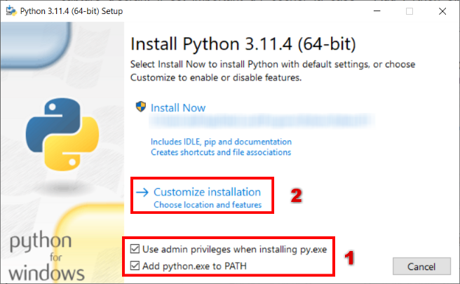 2.2) Dans la fenêtre Install Python, coche les cases Use admin privileges when intalling py.exe et Add python.exe to PATH, puis clique sur l’option Customize installation