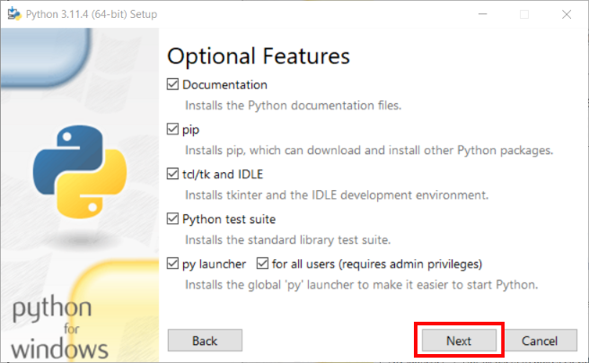 2.3) La fenêtre Optional Features s’affiche, elle permet de choisir les option à installer. Laisse les options par défaut puis clique sur le bouton Next