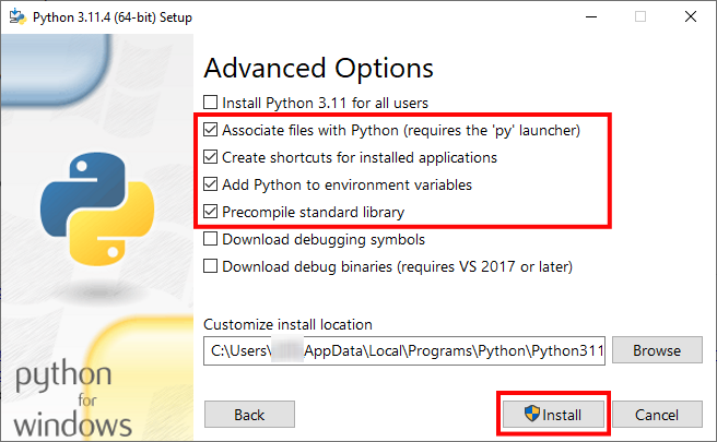 2.4) La fenêtre Advanced Options s’affiche ensuite, elle permet de choisir des options supplémentaires, notamment le chemin dans lequel sera localisé l’environnement Python. Par défaut il est installé dans le répertoire suivant: C:\Users\<userName>\AppData\Local\Programs\Python\Python311.