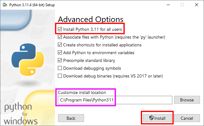 - Si tu disposes des droits d’administration sur ta machine, et que tu souhaites que tous les utilisateurs de la machine puissent utiliser Python, coche les option suivantes puis clique que le bouton Install. Dans ce cas le chemin d’installation change et Python sera installé dans le dossier C:\Program Files\Python311