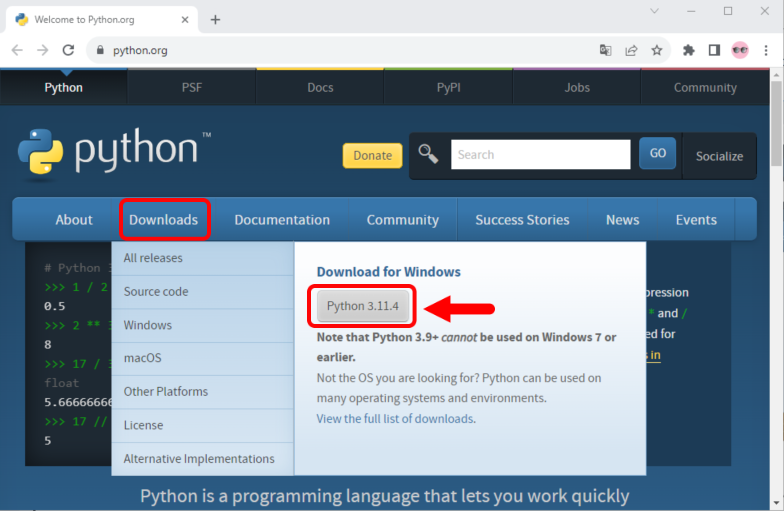 1.1) Ouvre le site officiel de Python en allant sur la page https://python.org. Dans la barre de navigation place ta souris le menue Downloads, puis clique sur Python 3.11.4 (dernière version disponible au moment de l’écriture de cette procédure).