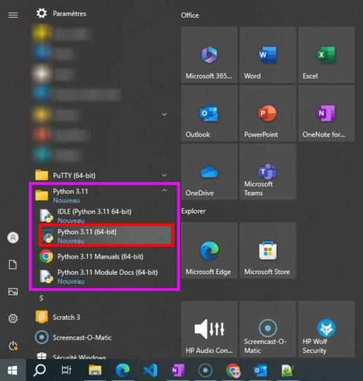 3.1) Ouvre le menu Démarrer, sélectionne le dossier Python 3.x correspondant à la version de Python que tu as installé, puis clique sur l’exécutable Python 3.x que tu as installé